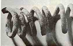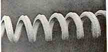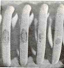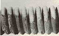 Goods heated in the kiln might give off gases liable to harm the KANTHAL elements . Harmful gases can be given off by enamels and glazes. Such attacks have no characteristic appearance but mostly take the form of carbuncles. Providing an attack has not reached too advanced a stage, its cause can generally be established by spectrographical analysis. Fig.5 shows a KANTHAL elements which was attacked by glazing fumes. Gases and fumes also penetrate into the furnace bricks, which means that replacement elements may have a shorter life than the original elements.