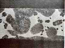 Attacks caused by splashes from materials treated in the kiln are usually of a localized character. By their color and characteristic appearance , splashes from enamel and glazes can often be diagnosed as the source of the trouble by purely visual examination. Fig. 6 shows attacks caused by glazing splashes.